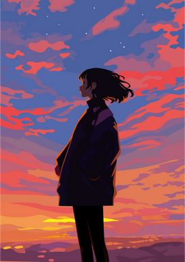 輪郭線は控えめで、人物や風景の形を自然に際立たせ、全体にやさしい温もりと落ち着きを感じさせます。